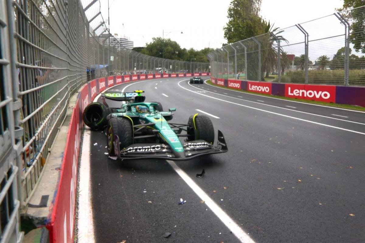 El accidente de Alonso provoca la salida del safety car y lo obliga a abandonar en la primera carrera de la temporada. A poco más de la mitad del Gran Premio en Melbourne, el piloto de Aston Martin pierde el control de su coche en una curva, y aunque intenta corregir la trayectoria, el vehículo trompea y termina estrellándose contra el muro.