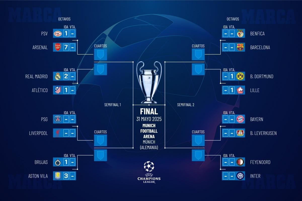 La goleada histórica del Arsenal en el campo del PSV ha aclarado el panorama en un lado del cuadro, ya que los de Mikel Arteta esperan rival en cuartos de final que saldrá del ganador de la eliminatoria Atlético-Real Madrid.