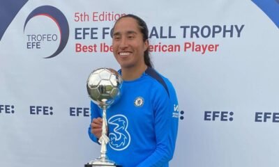 La goleadora del Chelsea de Inglaterra, la colombiana, Mayra Ramírez, recibió este viernes de manos del presidente de la Agencia EFE, Miguel Ángel Oliver, el Trofeo...