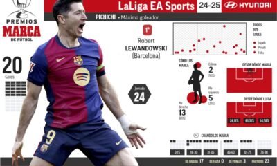 Robert Lewandowski (20 goles) mantiene la distancia con Kylian Mbappé (17 goles) en lo más alto de la lucha por el trofeo Pichichi de Primera división. ...
