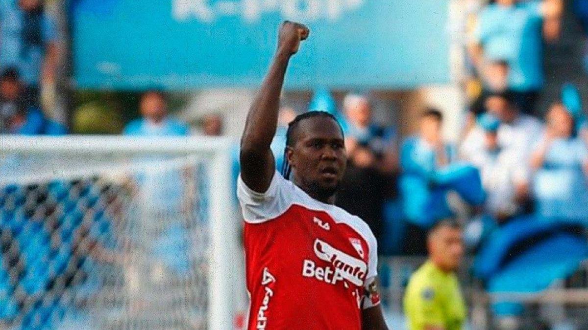 Santa Fe vs. Deportes Iquique. La celebración de gol de Stefan Pino. Foto:EFE
