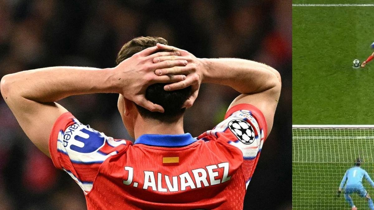 De esta manera, comenzaron a circular dos grabaciones: una, desde el ángulo detrás de la portería de Courtois, en la que se percibe que Álvarez toca ligeramente el balón con el pie de apoyo, el izquierdo, antes de lanzar.