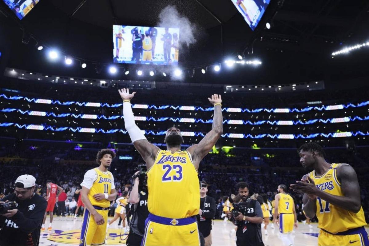 LeBron James arenga al público durante un partido de los Lakers.