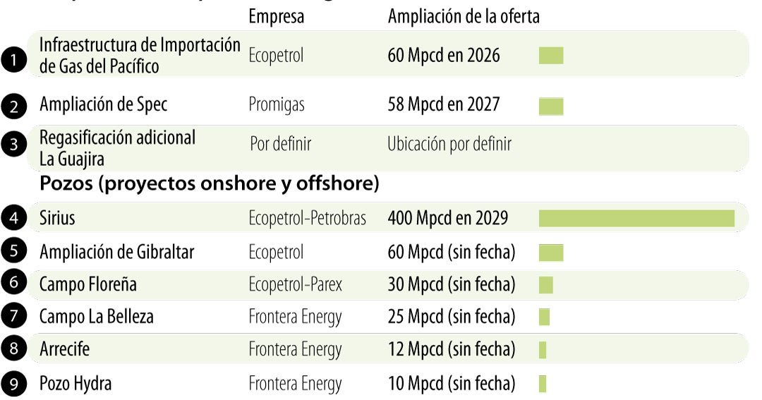 La situación del gas ha estado caracterizada por un contexto de escasez, lo que ha obligado a importar gas para atender la demanda local. Según Naturgas, en 2025 Colombia enviará al exterior el 4% de la demanda interna desde Trinidad y Tobago y Estados Unidos. De igual manera, pronostican que la carencia en el abastecimiento podría llegar al 7,5% de la demanda nacional este año y hasta un 16% en 2026.