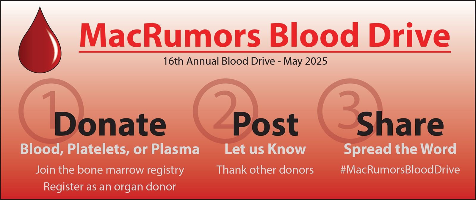 3. Difunda nuestro mensaje #MacrumorsBloodDrive con amigos, familiares y seguidores. ¡Ayúdenos a agradecer a los miembros del foro que comentan en el Macrumors 2025 Blood Drive! hilo.