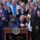 President Donald Trump bangs a gavel presented to him by House Speaker Mike Johnson of La., after he signed his signature bill of tax breaks and...