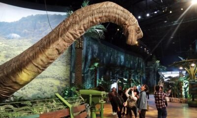 La expedición comienza con un trayecto en ferry hacia una isla colmada de dinosaurios. Tras un breve recorrido, un dinosaurio de largo cuello da la bienvenida...