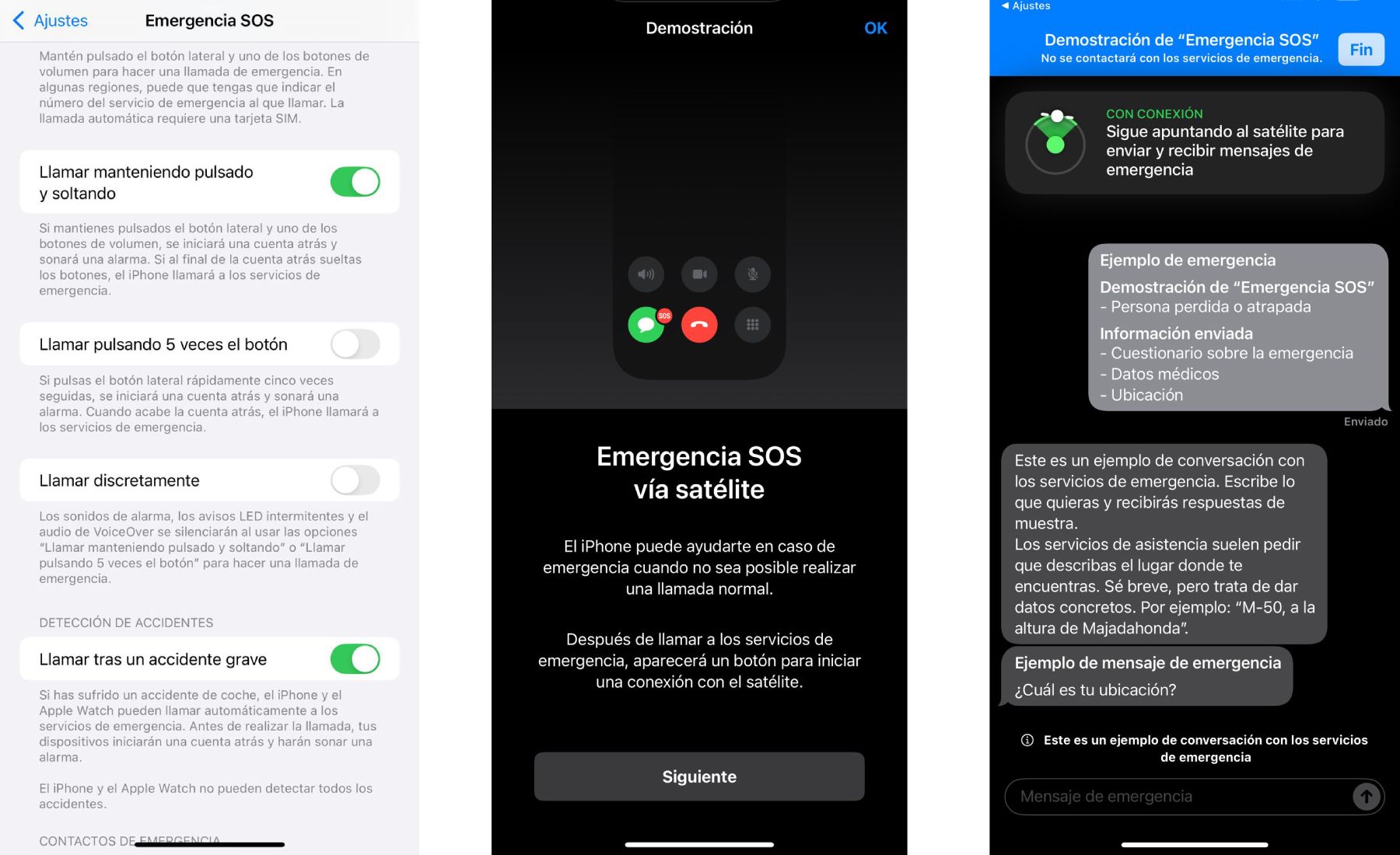Una vez que se produce la llamada automática, el sistema puede enviar también notificaciones a las personas designadas como contactos de emergencia, compartir la ubicación y, si el usuario lo ha configurado, poner a disposición de los servicios datos medicos basicos desde la pantalla bloqueada.
