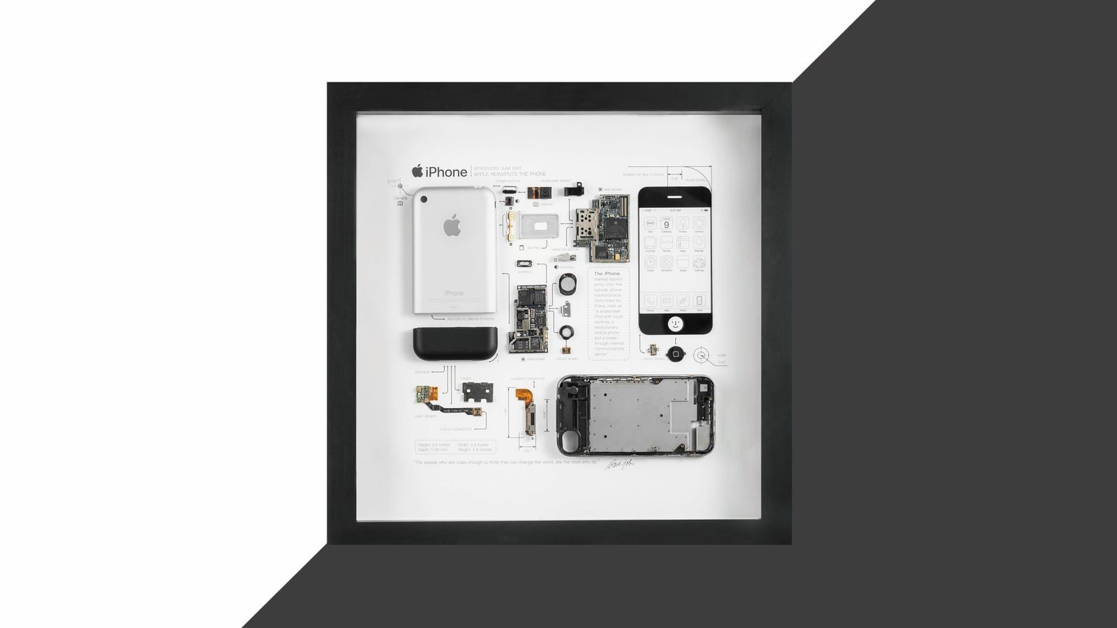Grid Studio desmonta iPhones, iPads, Mac y otros accesorios de Apple, mostrando hábilmente cada componente para proporcionar un aspecto dentro de los productos más emblemáticos de Apple. Las piezas están dispuestas en un marco y acompañadas de etiquetas y pequeños cositas de la historia de Apple.