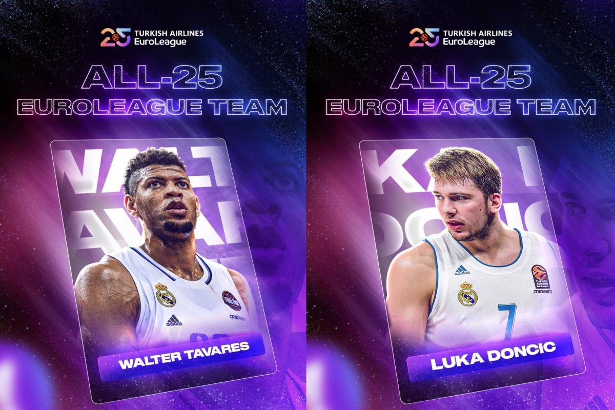 Walter Tavares y Luka Doncic han sido incluidos entre los 25 mejores jugadores en la historia de la Euroliga. El pívot del Real Madrid y el actual base de los Lakers son dos de los cinco jugadores incorporados al All-25 Euroleague Team, la lista que está elaborando la máxima competición continental con motivo de su 25 aniversario. Junto a ellos se incorporan otros tres mitos: Milos Teodosic, Dejan Bodiroga y Georgios Printezis.