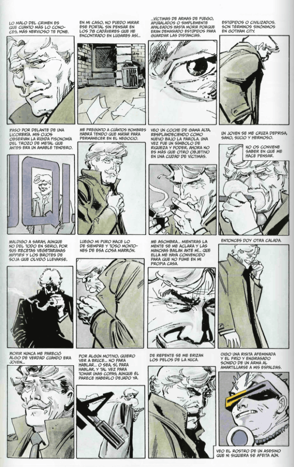 El personaje James «Jim» Gordon, el eterno comisario de policía, uno de los más cercanos compañeros de Batman en esta obra, está, como todos los que vemos pasar por ella, cansado, derrotado, sin ganas de seguir adelante; se aferra a una vida que ya desprecia. Las secuelas de décadas en Gotham City —50 años— son demasiadas para él y así se hace patente en este monólogo mientras lo vemos paseando.