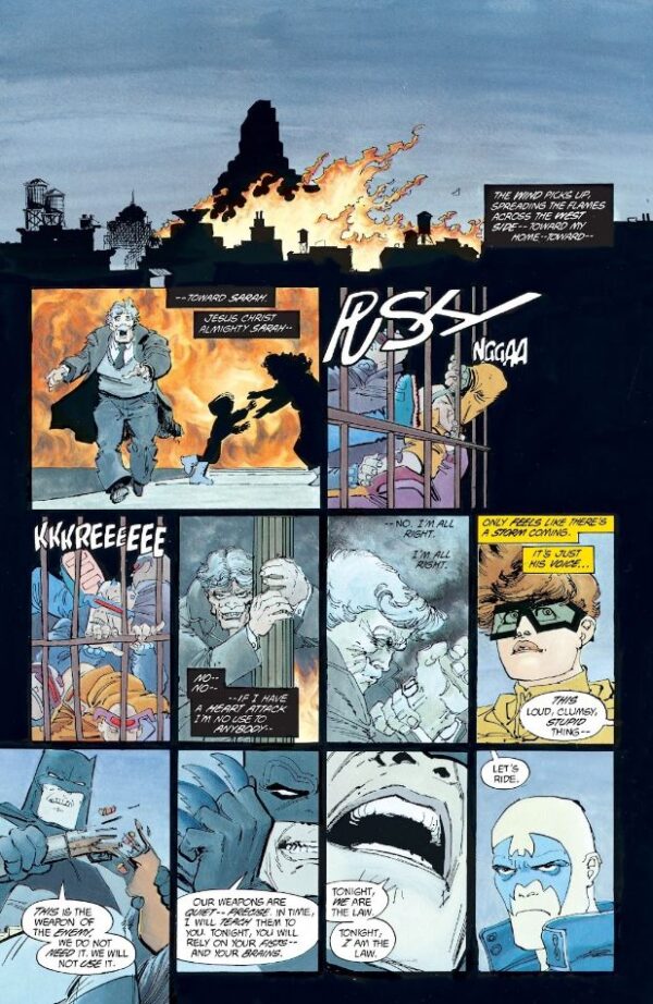 Este momento, esta frase, encarna muy bien lo que es Dark Knight Returns. Esa mezcla de fascismo individualista con anarquismo sin un objetivo claro. La lucha de un hombre que a estas alturas de la vida, no es ni mucho menos buena persona, contra un sistema que le oprime, pero al que pretende cambiar por una opresión propia, construida por él mismo. La lucha contra Superman, que simboliza todo lo bueno que la humanidad tiene que dar… en manos de un alienígena.