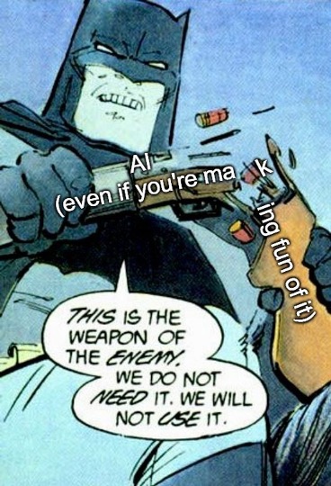 Batman coge una escopeta y la parte por la mitad. Es un momento icónico de esa gran obra que es el Regreso del Caballero Oscuro. Pero hay algo raro en ella. Algo distinto. Un detalle que no puede pasar desapercibido al lector. Y es que en la escopeta que el cruzado enmascarado ha reventado está escrita la palabra “IA” o lo que es lo mismo, Inteligencia Artificial. El texto añade entre paréntesis «Incluso si te ríes de ella».
