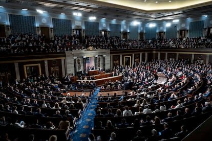 En un discurso de dos horas, Trump ha vuelto al tema de la inmigración una y otra vez. Además de repetir lo que ha venido diciendo desde la carrera presidencial de 2024 —que la inmigración equivale a un aumento de la delincuencia y que su predecesor, Joe Biden, llenó Estados Unidos de criminales, violadores y asesinos durante su mandato—, el republicano ha celebrado su campaña de detenciones y deportaciones masivas y ha asegurado que, bajo su liderazgo, las fronteras del país están más seguras que nunca. “Lo único que se interpone entre los estadounidenses y una frontera totalmente abierta en este momento es el presidente Donald J. Trump y nuestros grandes patriotas republicanos en el Congreso”, ha afirmado.
