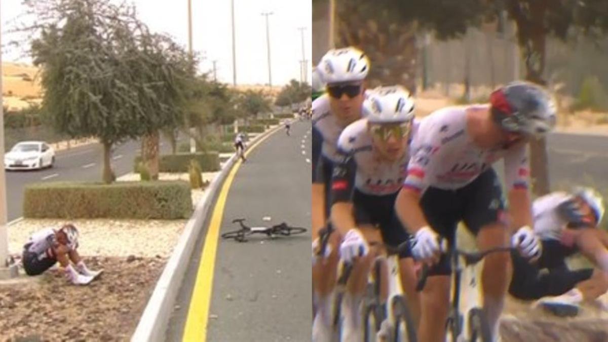 Juan Sebastián Molano, a la rueda de Tadej Pogacar, sufrió violenta caída en el UAE Tour