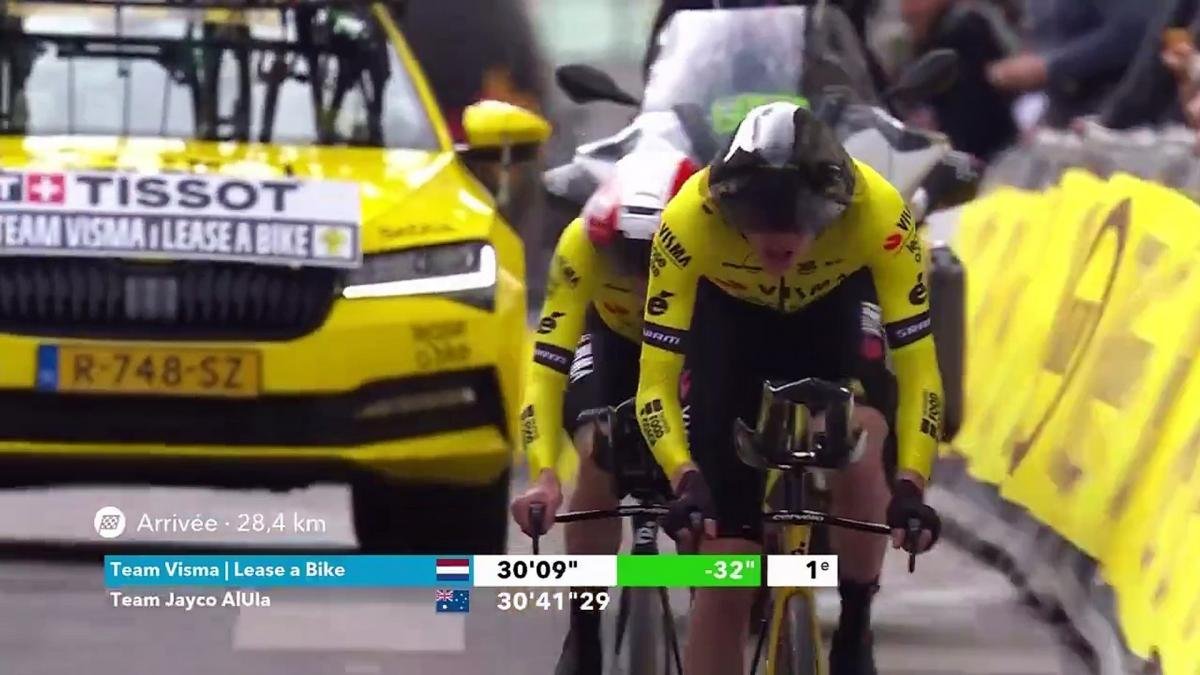 Visma – Lease a Bike fue el único equipo que logró una media superior a 56 km/h para imponerse en la etapa con un tiempo en meta de 30:26”. También fijaron el intervalo más rápido en el primer sector. La ruta de 28,4 km transcurrió entre el Circuito de Magny-Cours y el centro de Nevers.